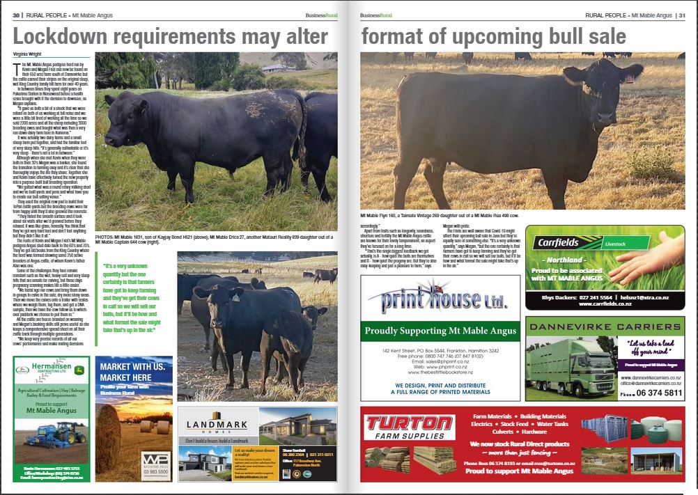 "We just about needed it all in the end, there wasn't much left over," Friel said.The two studs have already out a joint-custody arrangement of sorts, with the bull to spend three weeks at each property over mating.SCREENSHOTOnline videos had piqued the Friels' interest in the bull but seeing him in the flesh confirmed it.Semen will also be collected at the Tararua Breeding Centre, initially for sale to Australian breeders and for use on his home studs.Cricklewood studmaster Humphrey Bayly told the Gisborne Herald they were “absolutely delighted” with the top price.Although others had suggested the bull could be extremely valuable, he hadn't been so sure.“It was such a delightful surprise. That's a huge amount of money.”Cricklewood's next highest priced bull was a $35,000 animal sold to the Ratanui Stud from Tolaga Bay.The stud finished the day with an average of $37,750.Lockdown requirements may alter format of upcoming bull saleBusiness Rural North - Autumn/Winter 2020The Mt. Mable Angus pedigree herd run by Kevin and Megan Friel can now be found on their 650 acre farm south of Dannevirke but the cattle earned their stripes on the original steep, wet King Country family hill farm for over 40 years.In between times they spent eight years on Pukerimu Station in Norsewood before a health scare brought with it the decision to downsize, as Megan explains.“It gave us both a bit of a shock that we were reliant on both of us working at full noise and we were a little bit tired of working all the time so we sold 2200 acres and all the sheep including 3000 breeding ewes and bought what was then a very run down dairy farm here in Kumeroa.”Click this link to read the full story__________________________________________________________________________________________________________________________________Spirited bidding at Mount Marble yearling sale30 Sep, 2019 11:43am